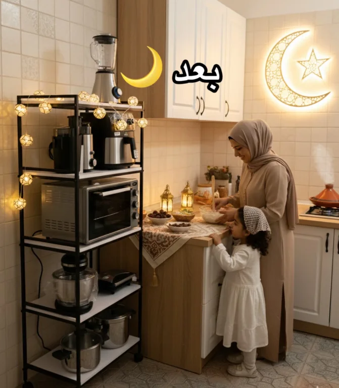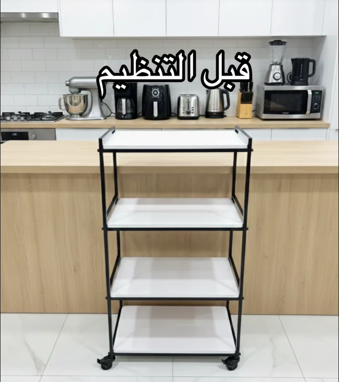 إلى كان المطبخ ديالك صغير ولا كيتعمّر بسرعة بالأجهزة (blender، ماكينة القهوة، microwave…) هاد الرف هو الحل: كيعطيك تنظيم عمودي ذكي وكيخلّي كل حاجة فبلاصتها. الرفوف المتعددة كتخليك تفصل بين الأواني، القنينات، التوابل، وأجهزة الطبخ باش يبقى المطبخ مرتب وكيبان أنيق